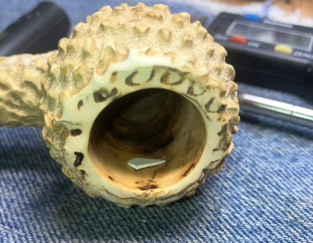 These pieces showed many surface flaws. I assumed that these flaws would also likely be found inside the pieces and would only be exposed by drilling or cutting the meerschaum This is what I thought were the source of the “hole” in the Kaywoodie.