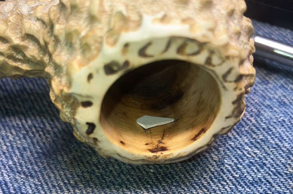- Cut a piece of meerschaum, from a piece of scrap meerschaum, that would be fit to the hole on the inside of the tobacco chamber. This would be like an inlay.