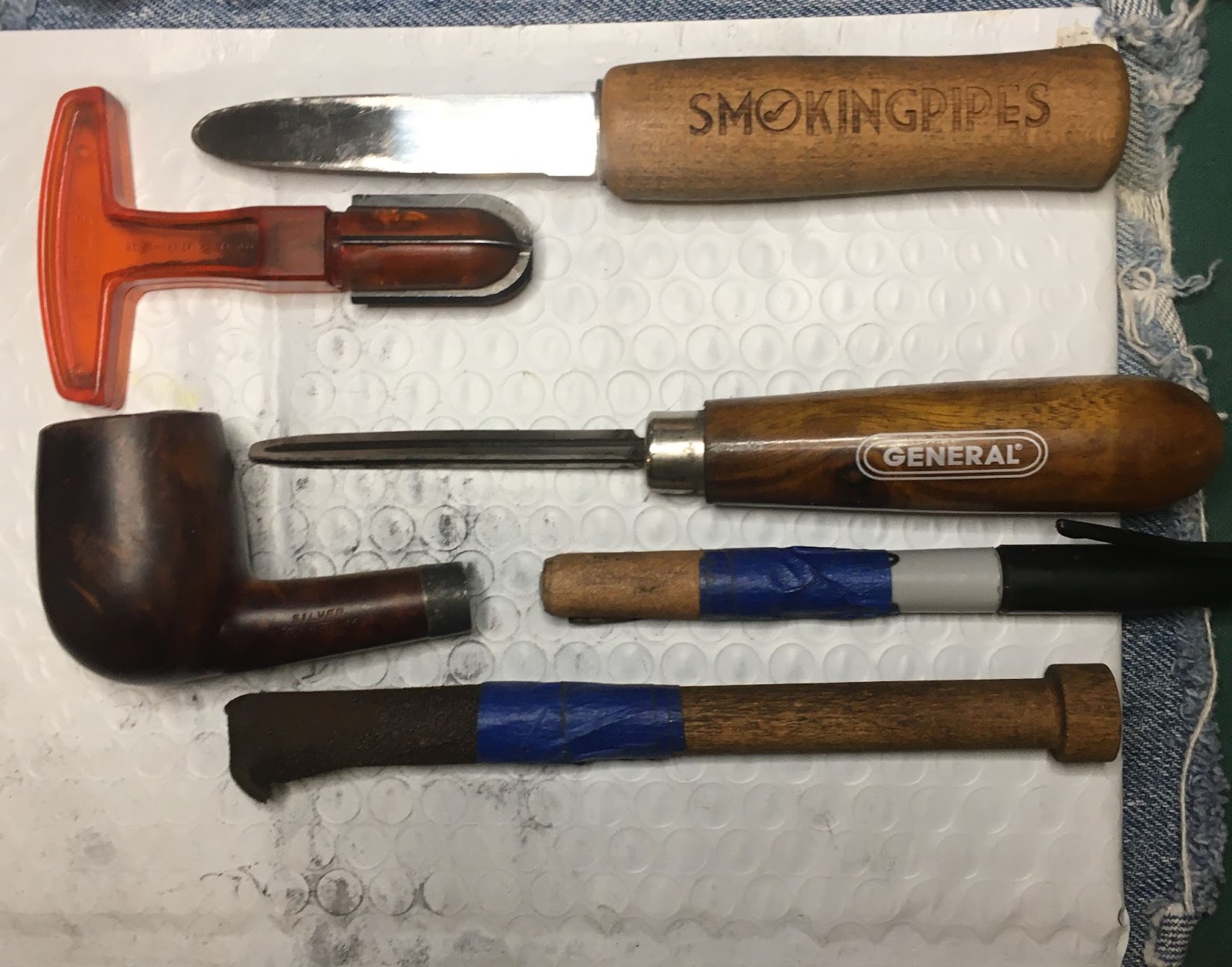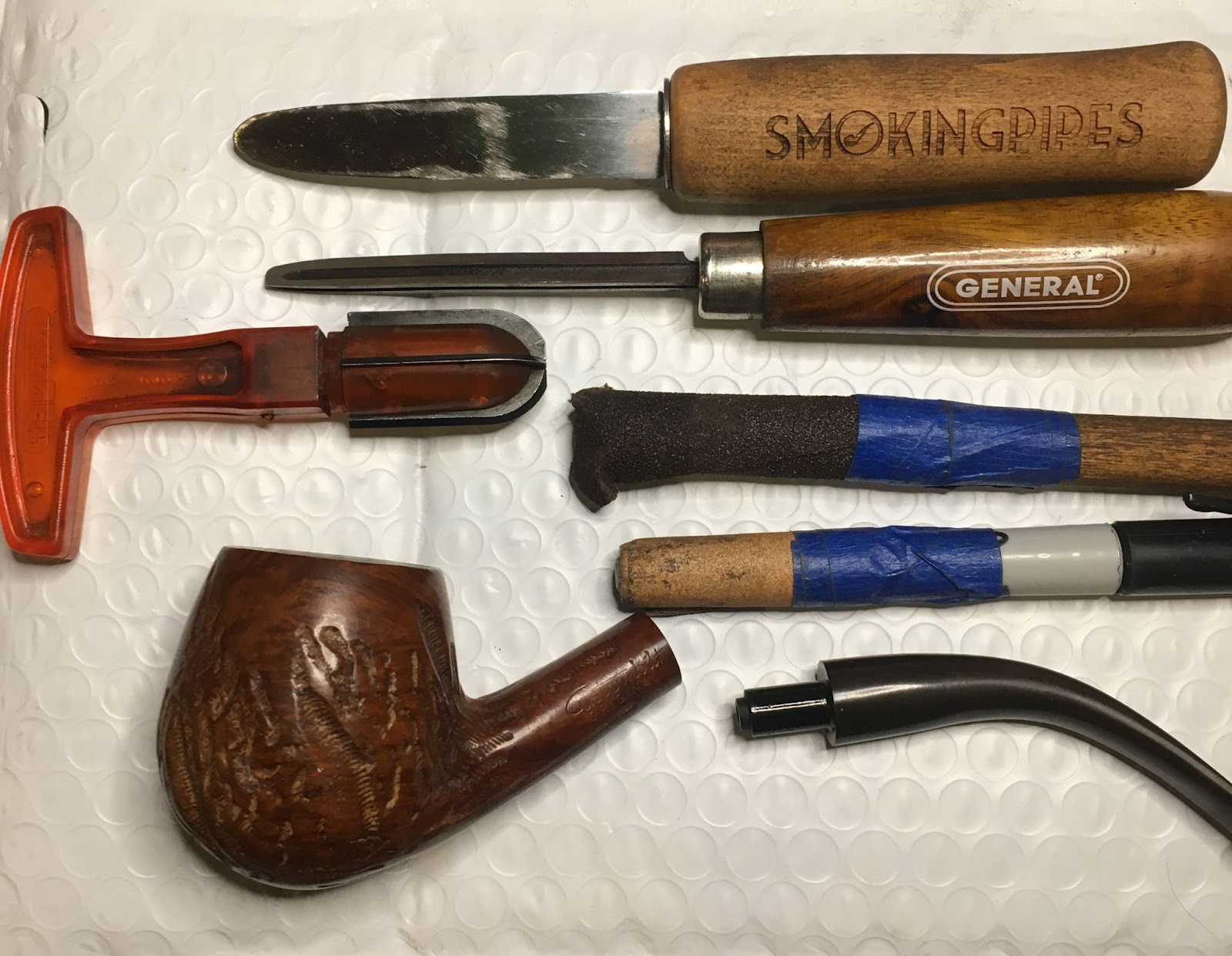 In the meantime, I prepped the work surface for the reaming. I placed the white plastic surface, PipNet with the #2 & #3 blades, General triangular scraper (with the tip ground round), Smokingpipes Low Country knife, 220 sandpaper wrapped wood dowel and the 320 sandpaper wrapped Sharpie marker.
