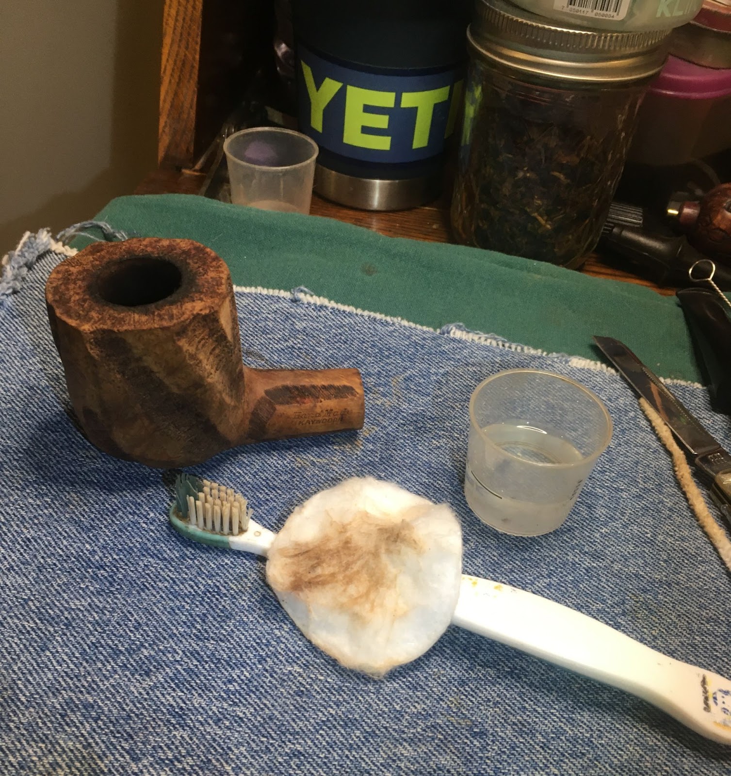 After the scraping I took the stummel to the sink for a scrub with Murphy’s Oil Soap. The soap was used undiluted and scrubbed with a medium bristle toothbrush. When finished the stummel was rinsed with warm water and dried with a cotton dish towel. At this point I poured approximately 3 ml of 95% ethyl alcohol into the bowl and holding my thumb over the rim and finger over the mortise, I let the alcohol flow through the interior of the pipe. The hydrophilic nature of 95% ethyl alcohol will pull water from the briar putting it in solution with the alcohol as well as soften the yuck in the shank. I used a nylon shank brush to scrub the airway. I poured the alcohol into a medicine cup. By looking at the color of the alcohol I could gauge how dirty the airway was – not too bad.