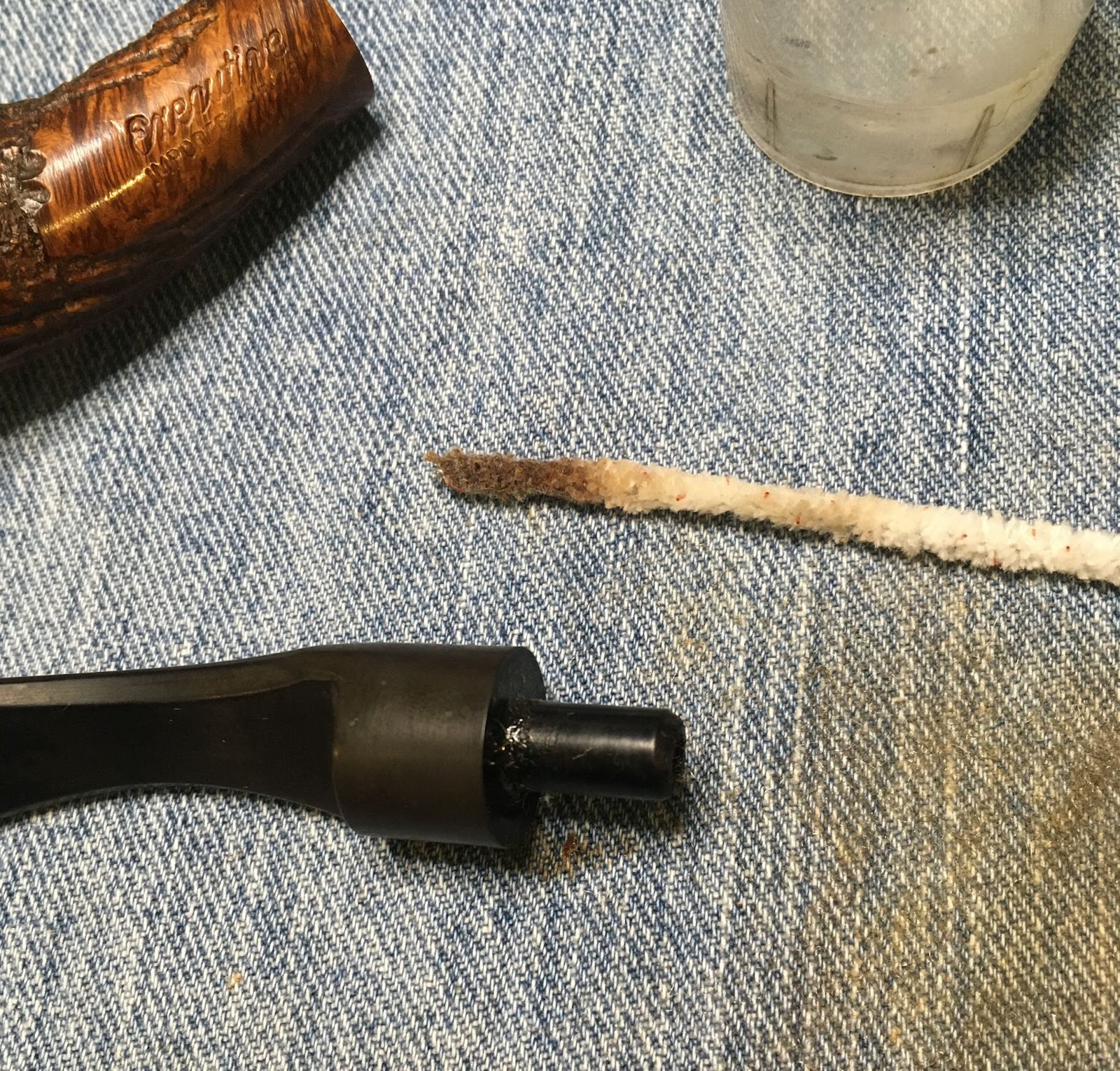 Next I wanted to clean out the air way to keep that tar and yuck (the technical term for smoking residue) from the deoxidizing solution. I first tried an alcohol dipped bristle pipe cleaner. I could only get it about ½ inch or 1cm into the tenon end of the stem. I tried a non-bristle pipe cleaner with about the same result.