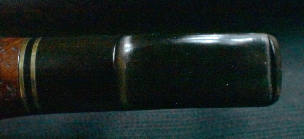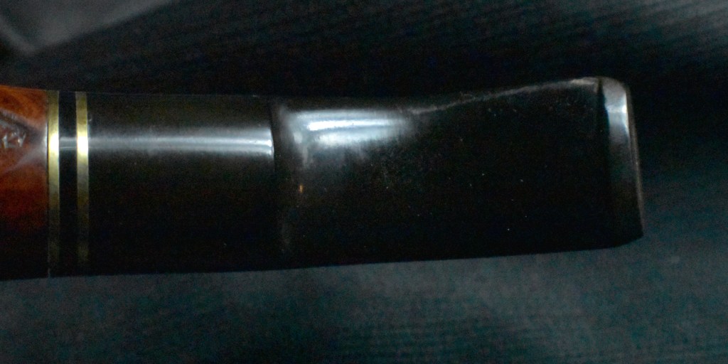 Another clue to the date of this Kaywoodie can be found with the stem logo. According to the Kaywoodie Collector’s Guide from the pipedia.org site, “Early (pre-1936) Kaywoodies had an “elongated” white cloverleaf on the bit, a large fitment, and four-digit shape numbers. The 1936 catalog shows a larger, “fuller” leaf, but lists two-digit shape numbers. Sometime between 1936 and 1947, the better pipes were marked on the bits with a black cloverleaf in a white circle. The white cloverleaf continued on the lesser pipes. However, this was not a consistent convention, as pipes of the same grade could have either type of leaf.” (Collector’s Guide to Kaywoodie Pipes – Pipedia). Again the dates here intricate the 1936-1947 period but show no definitive years.