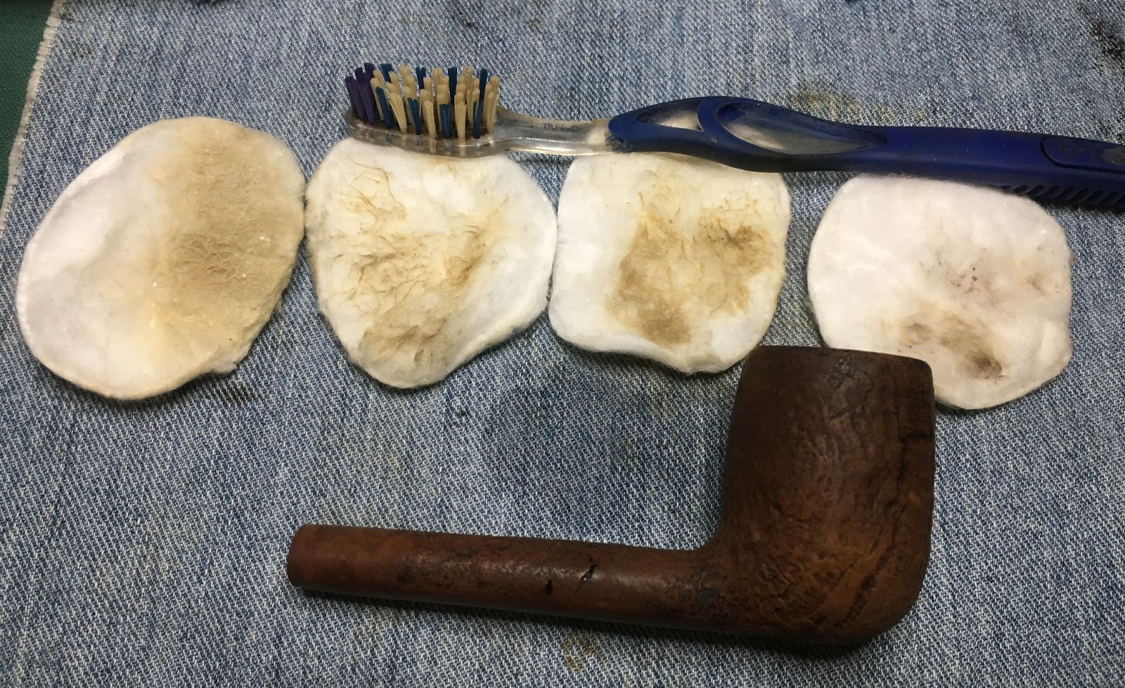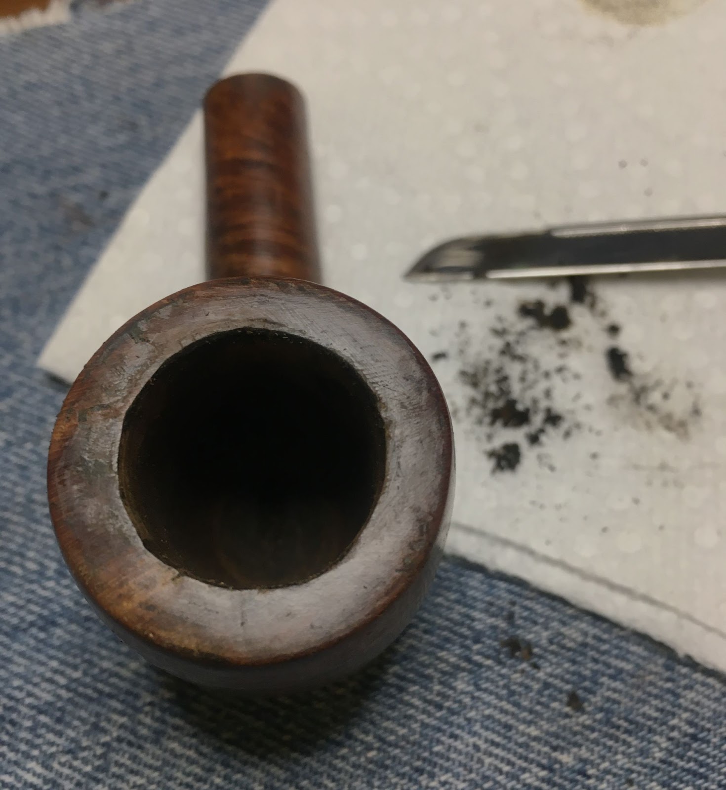 The rim of this old French billiard had definite lava accumulations. This was softened with saliva and scraped with a sharp pocket knife.