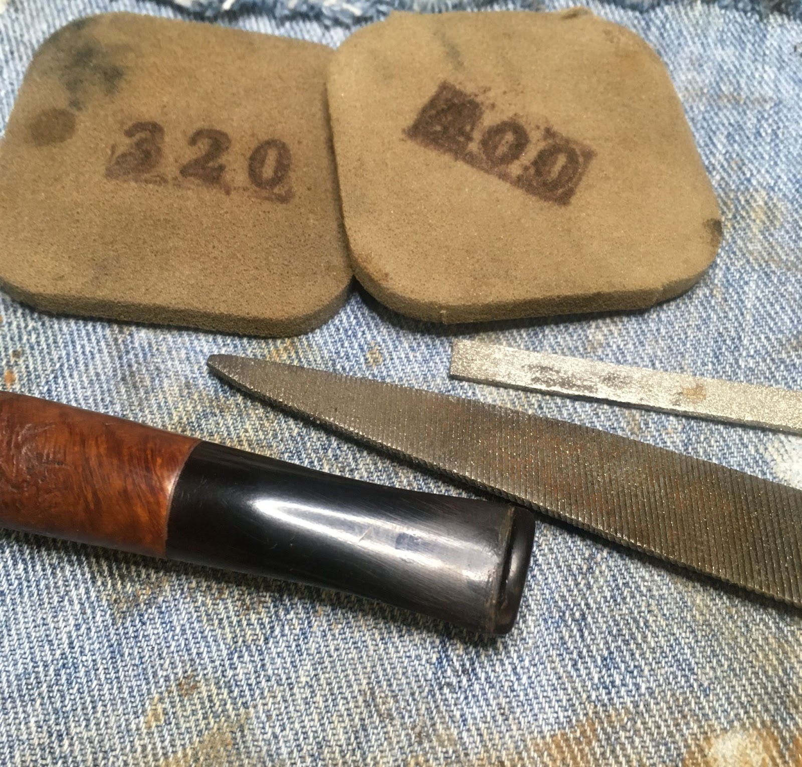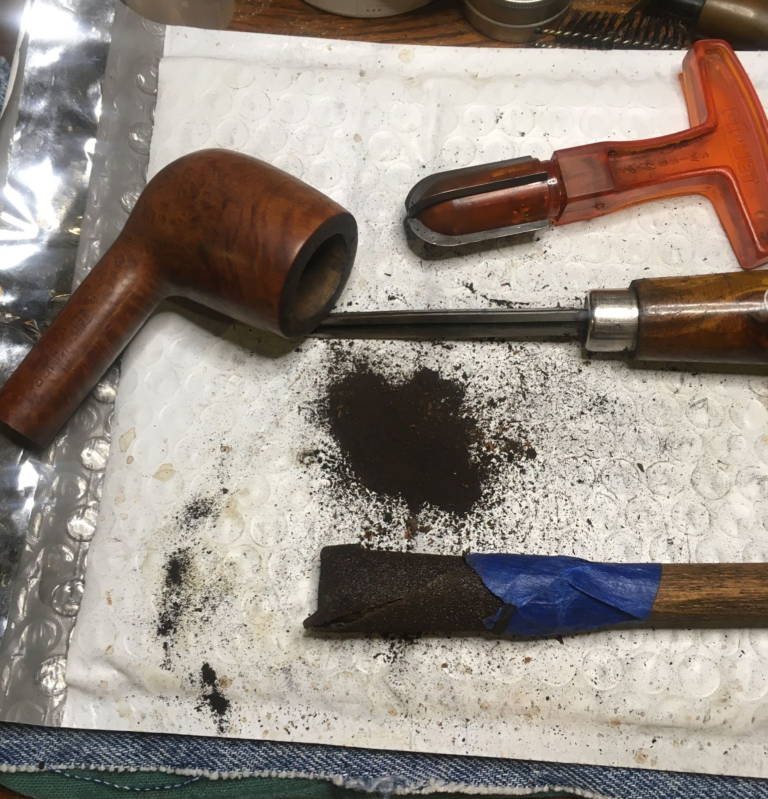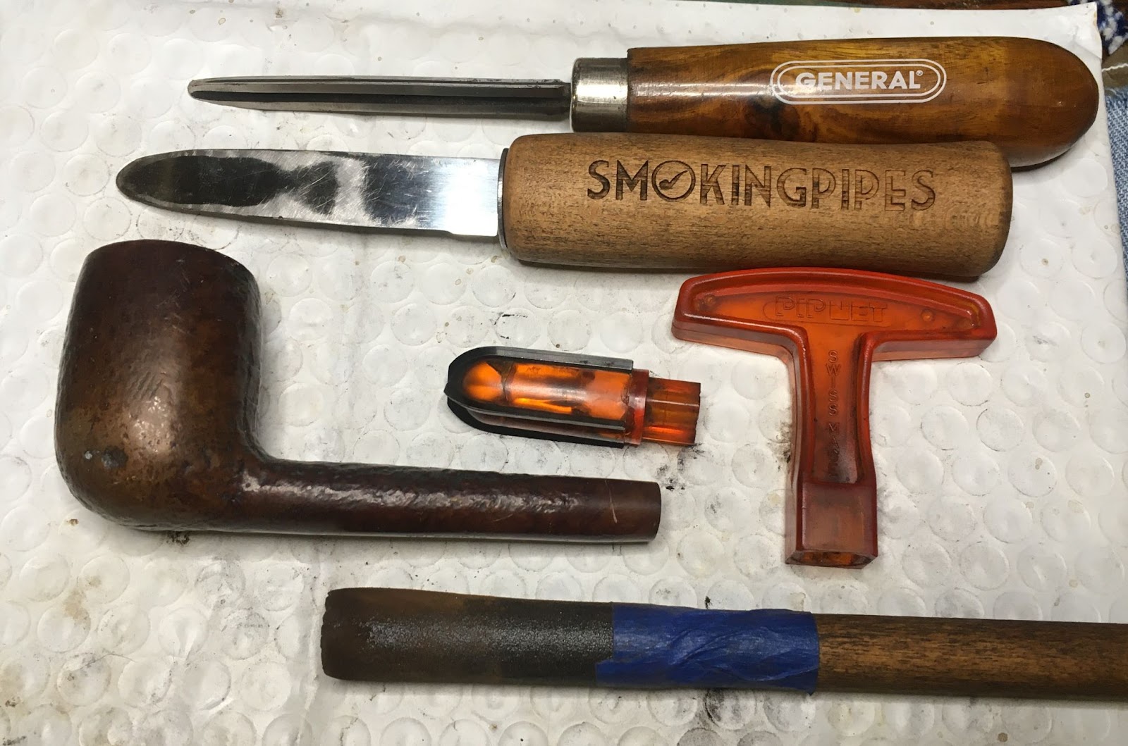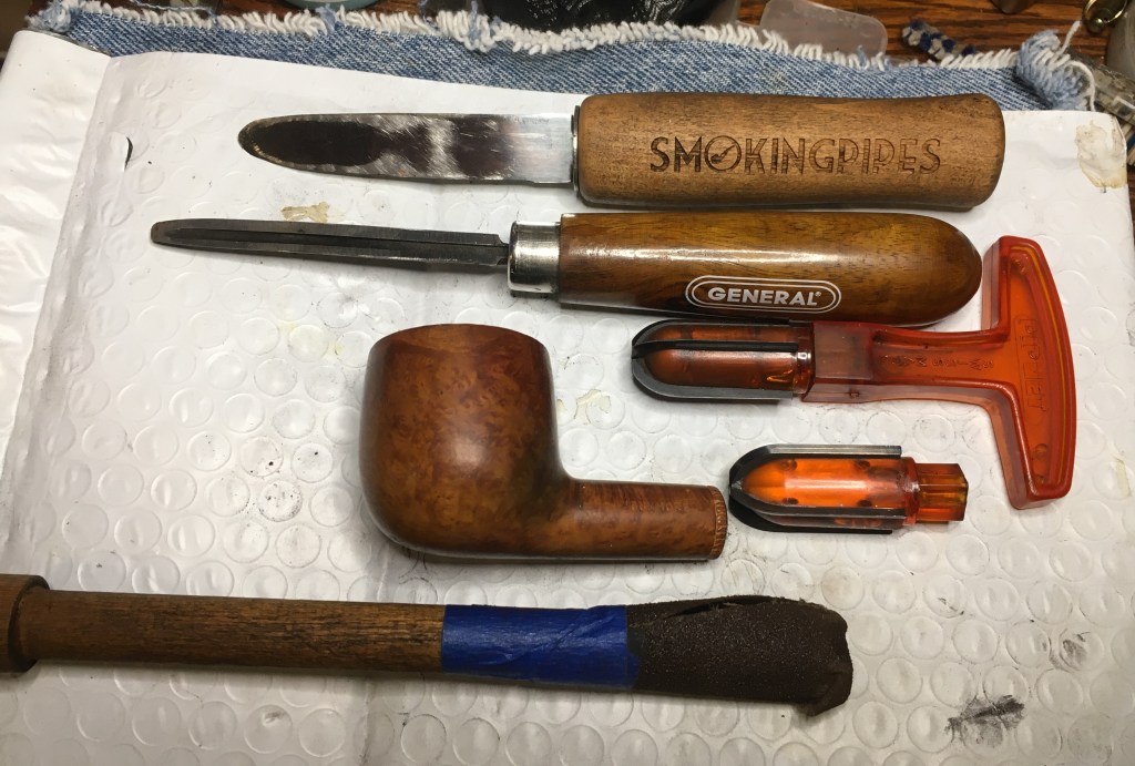 The reaming tools were gathered and included the Scotte Stainless Steel reamer rather than the traditional PiNet reamer due to the narrow tobacco chamber and the fact that my PiNet #1 blade suffered a catastrophic failure. The Scotte did a fine job and only required a small amount of scraping with the Smokingpipes Low Country Reaming knife and the General triangular scraper.