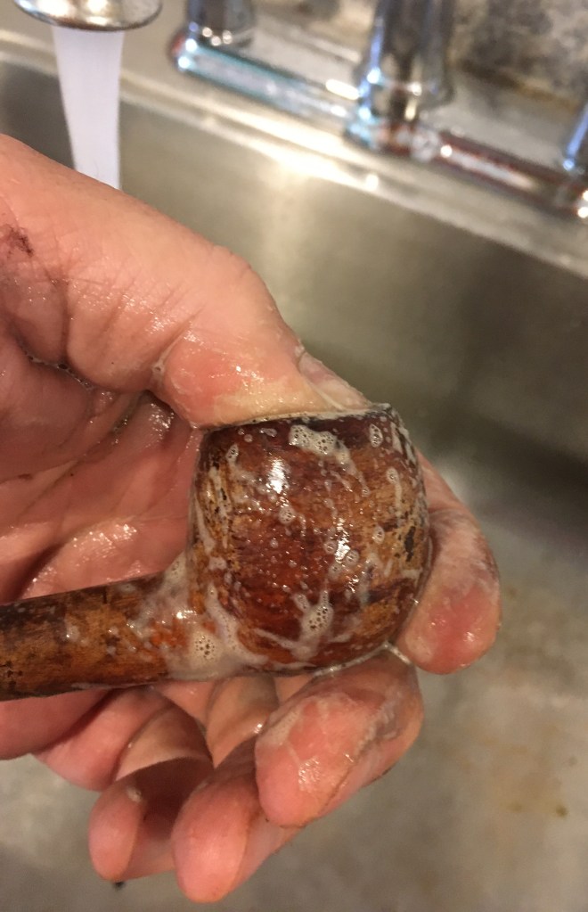 Seque to the scrubbing. The stummel was taken to the sink for a scrubbing with undiluted Murphy Oil Soap and a medium toothbrush. The soap was rinsed with warm water and the stummel was dried with a cotton dish towel.
