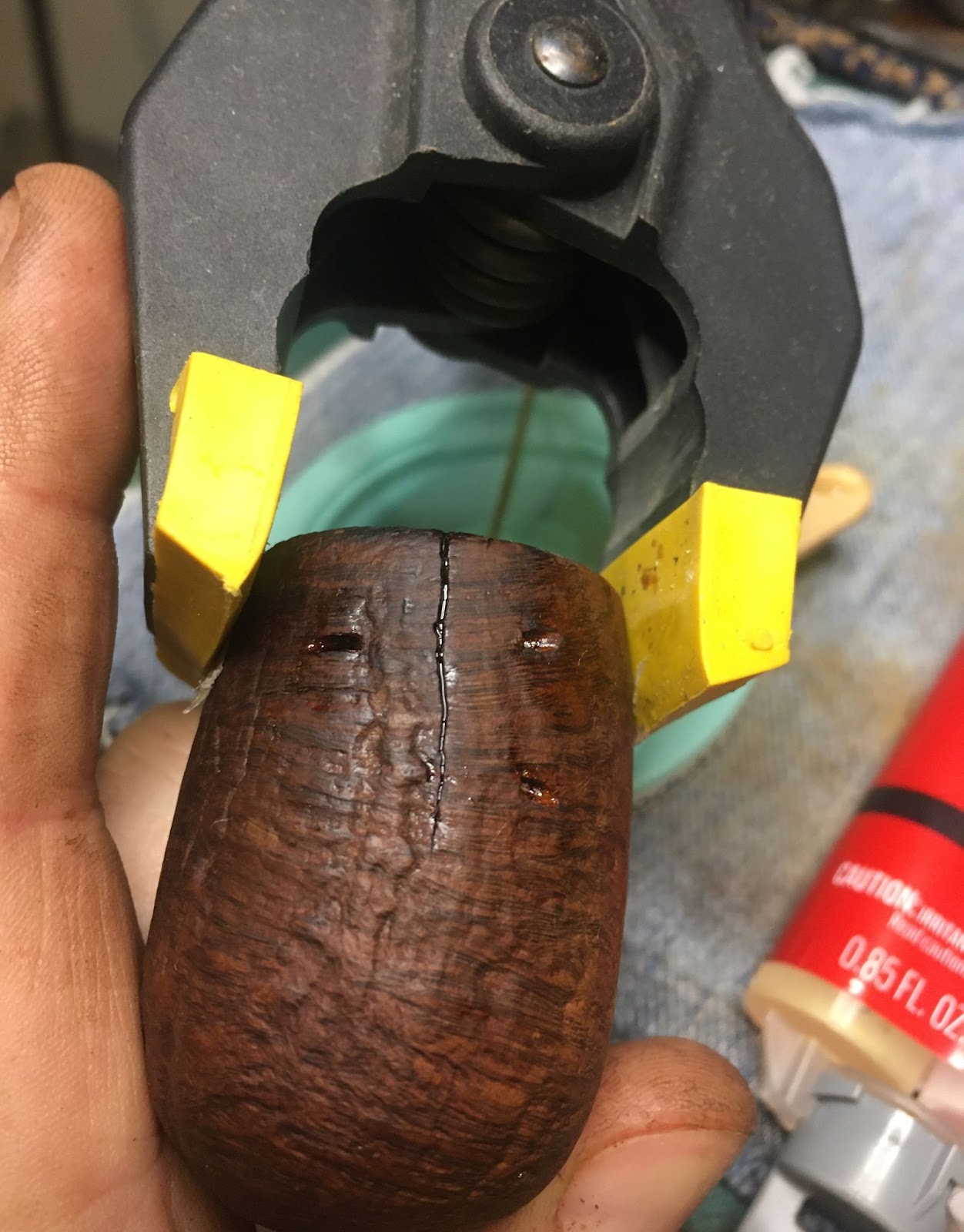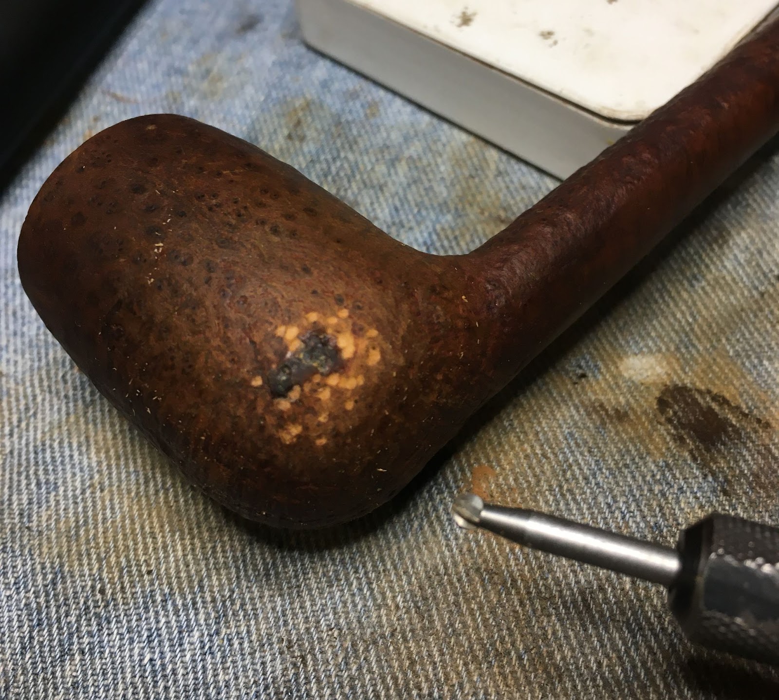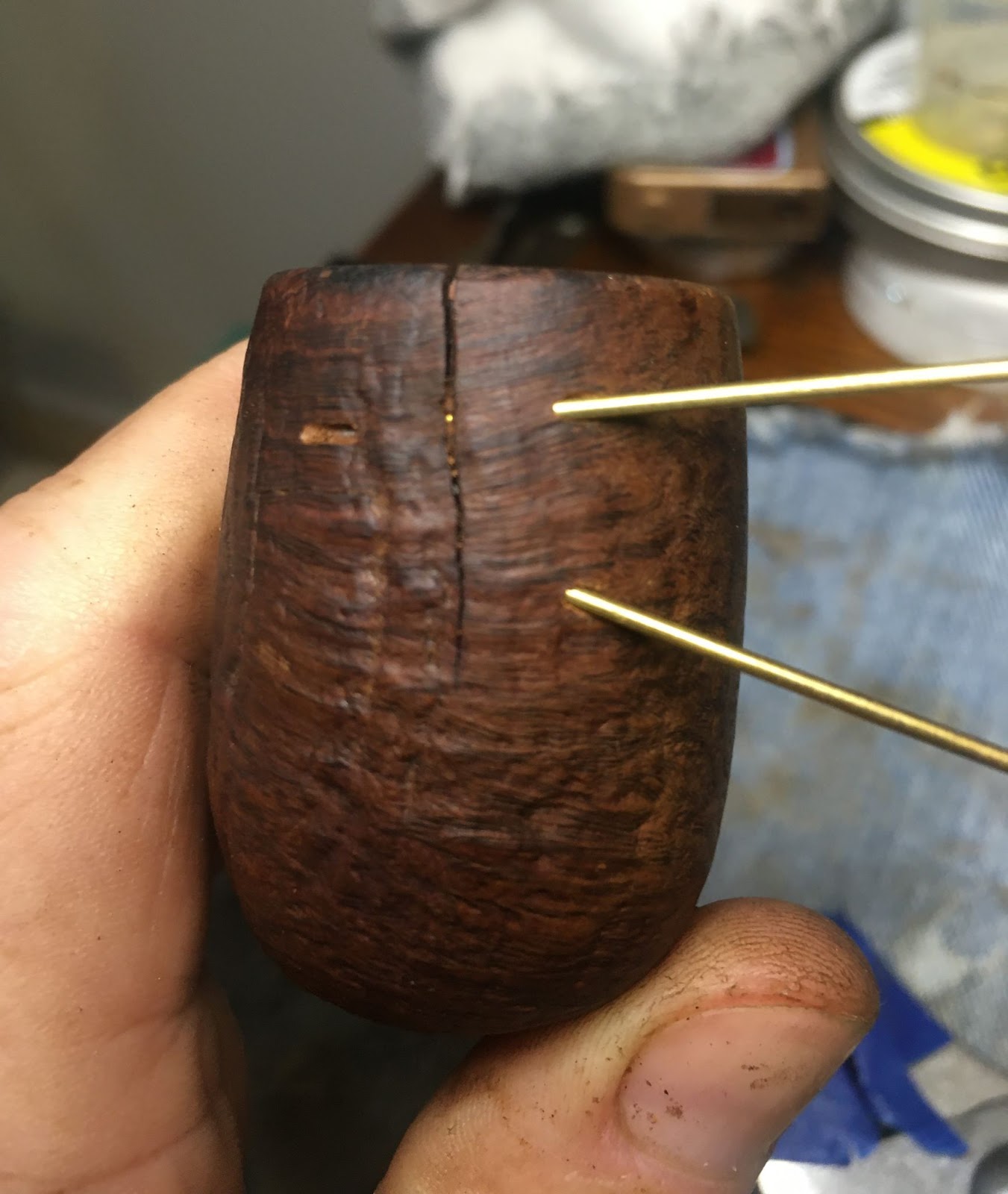 The gouges received a small drop of CA applied with a fly tying bodkin. While the CA was still wet I scooped a small amount of briar dust with a dental scraper and placed the dust on the wet CA. This was then pressed into the wet CA in the depressions..