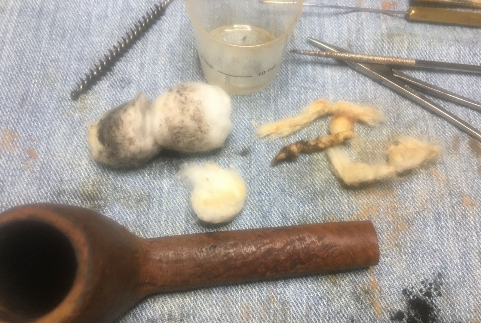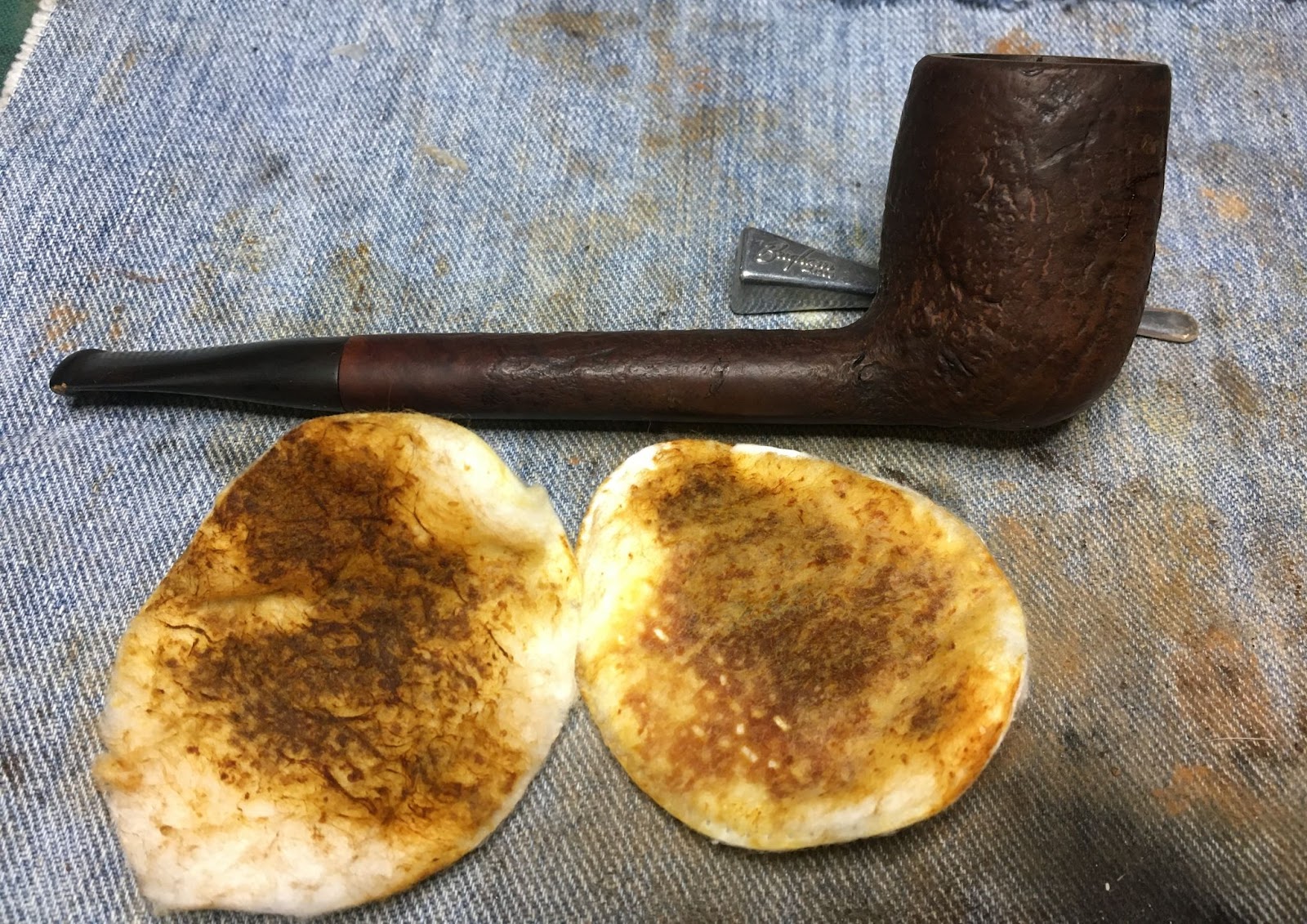 An 95% ethyl alcohol wetted make-up pad was used to scrub the stummel. A good deal of color came off the stummel. This indicated that wax, finish and stain were being removed.