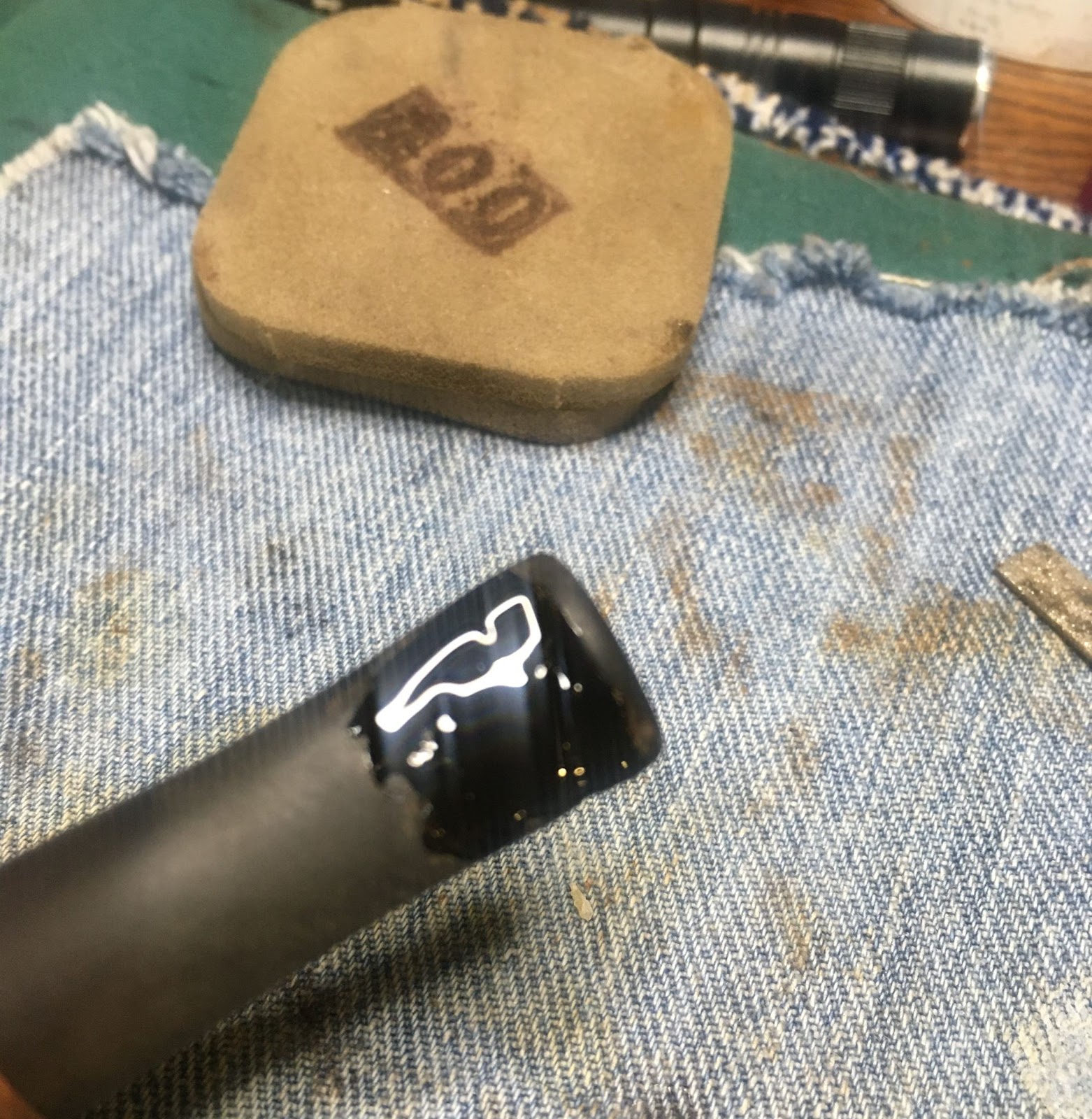 The stem was then sanded with a sequence of sanding sponges from 600-3500 grit. I did cover the stem logo with a small piece of painters tape to protect it from the sanding. Between each sponge I rubbed mineral oil onto the stem with my fingertip and wiped the stem with a paper towel.